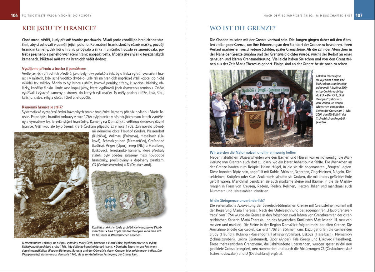 Struktura knihy vycházela z interpretačního plánu expozice, který definoval deset přelomových období a událostí hraničního regionu. Deset kapitol tvoří česko-německé dvoustrany, které vždy pokrývají vybrané téma z daného období.